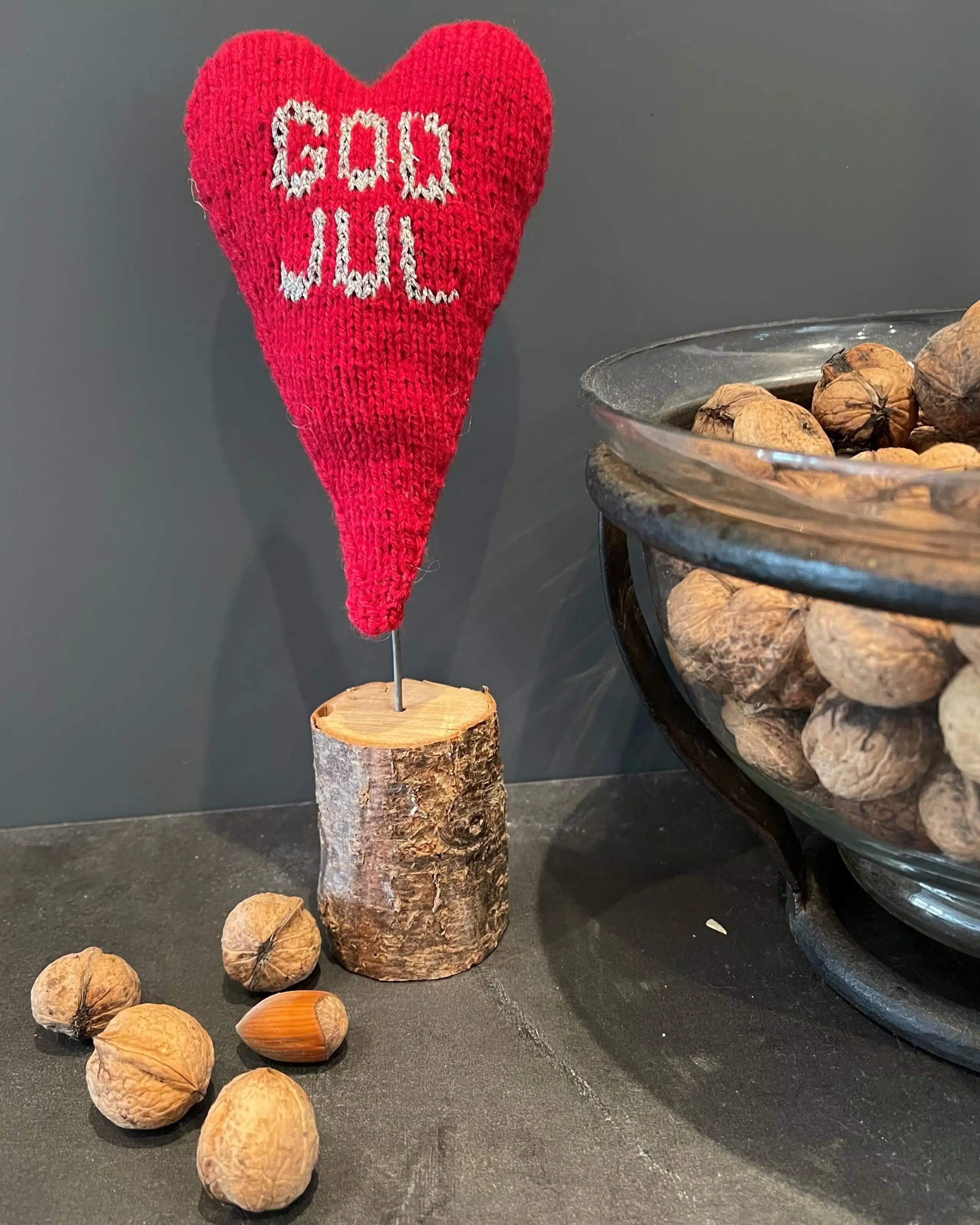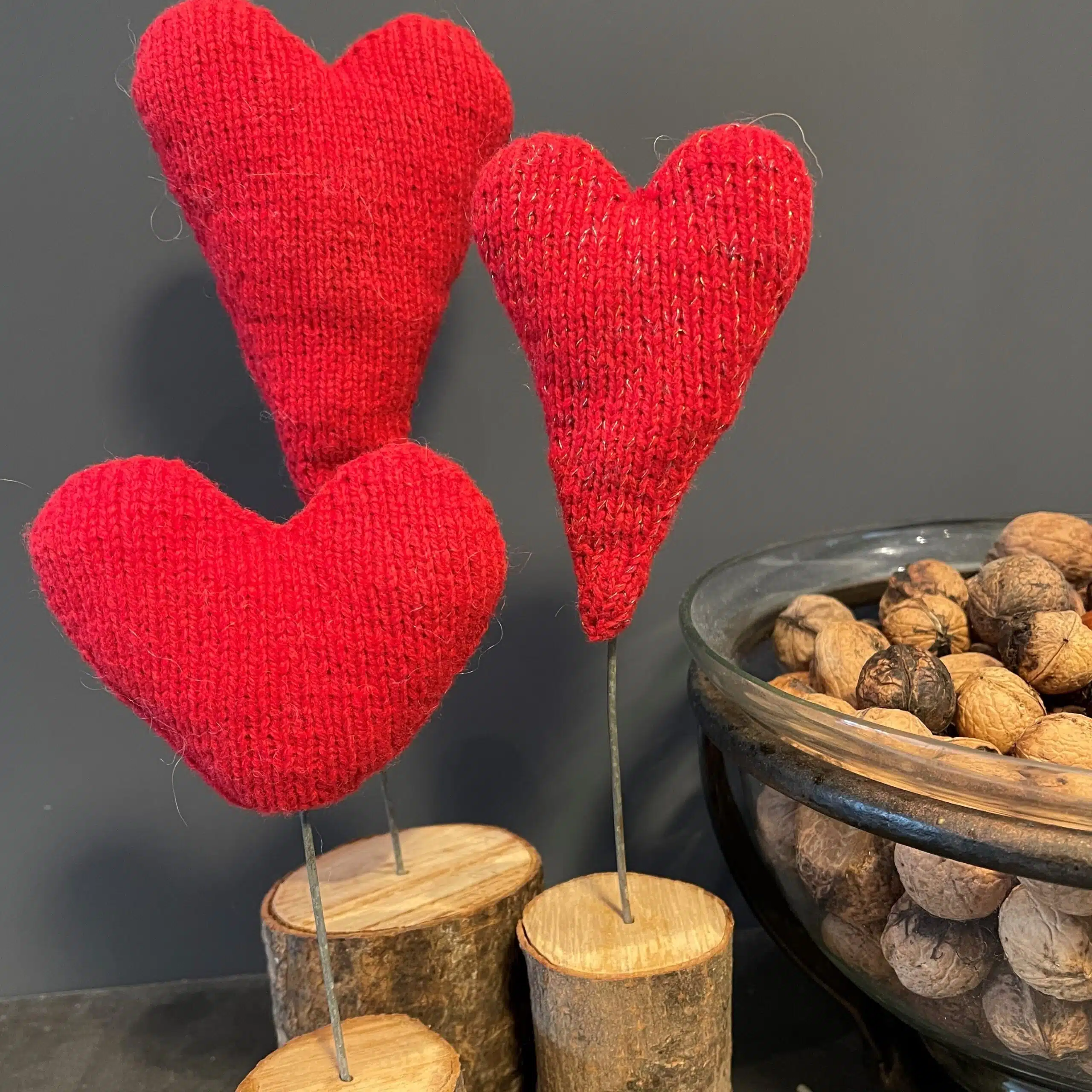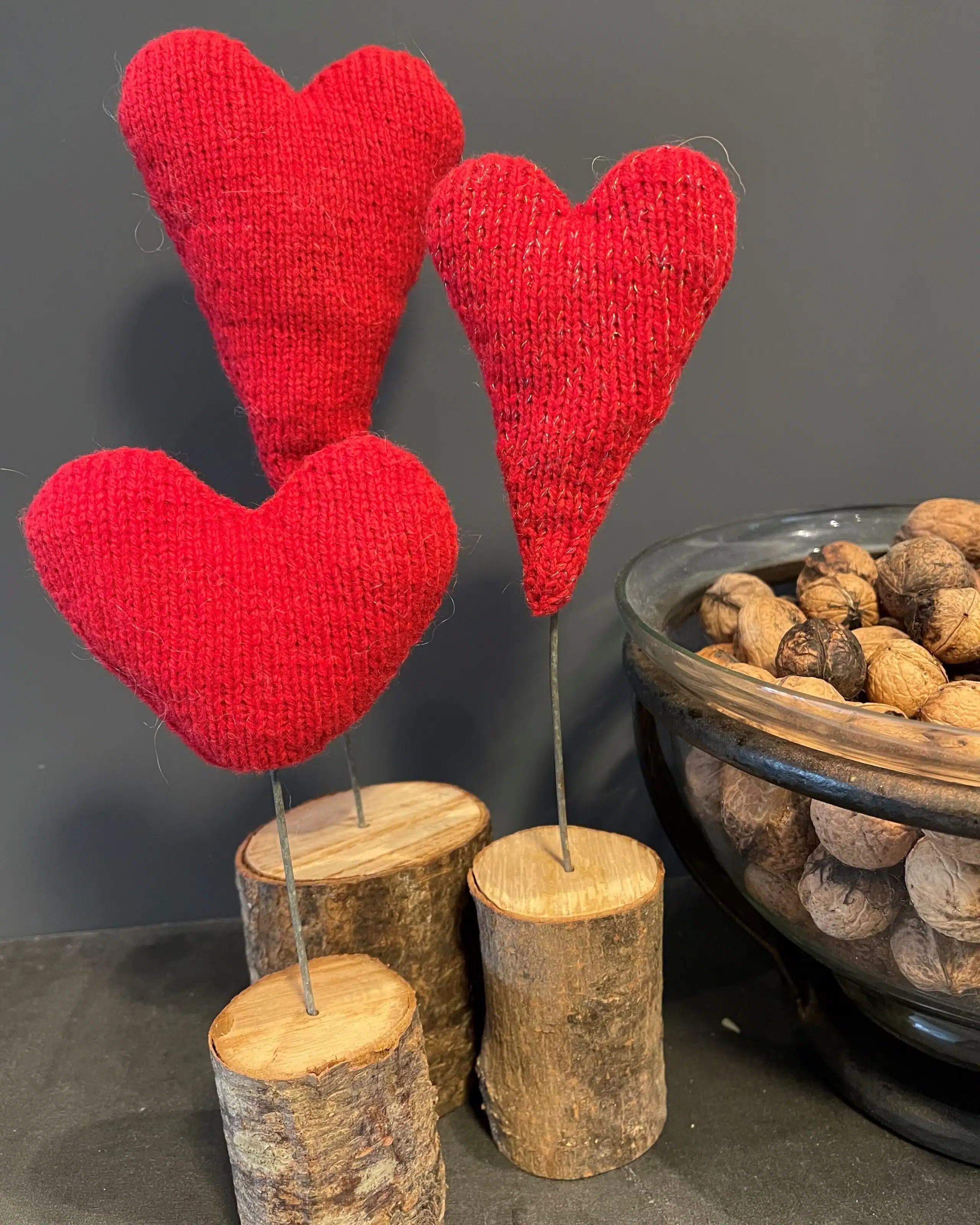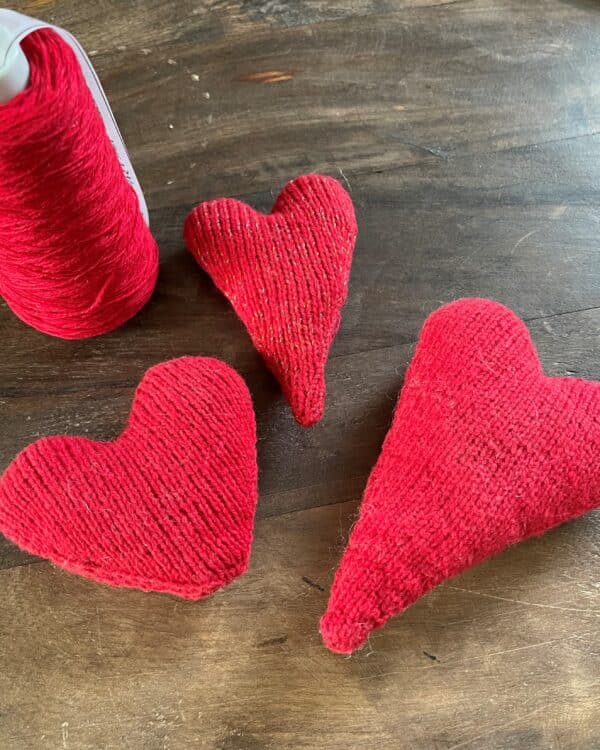 Hjerterne strikkes oppe fra og ned i to dele og sys sammen.
